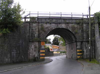 Single-arch limestone ashlar railway bridge over road, opened 1848. Limestone ashlar walls (including to abutment walls) with limestone ashlar dressings including advanced flanking piers, cut-limestone stringcourse, and cut-limestone course to parapet having cut-limestone coping supporting replacement steel railings. Single round arch on rusticated limestone ashlar risers having cut-limestone stringcourse to spring of arch, channelled voussoirs having keystone, and limestone ashlar soffits. Sited spanning road.