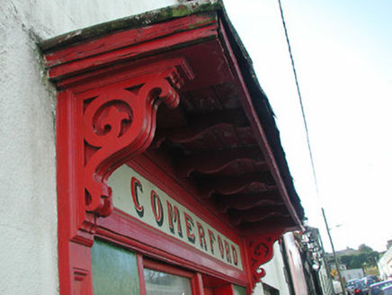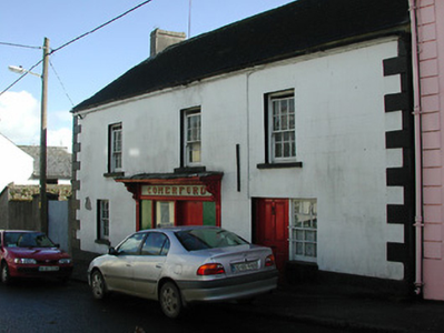 End-of-terrace three-bay two-storey house, c.1825. Renovated, c.1900, with shopfront inserted to centre ground floor. Reroofed, c.1950. Now disused to ground floor. Pitched roof with replacement artificial slate, c.1950, clay ridge tiles, rendered chimney stacks, and cast-iron rainwater goods on rendered eaves. Painted rendered, ruled and lined walls with rendered quoins to ends. Square-headed window openings with cut-limestone sills, and six-over-six timber sash windows. Square-headed door opening with timber panelled door. Timber shopfront, c.1900, to centre ground floor with panelled pilasters, fixed-pane timber display window, timber panelled half-door, fascia over, and projecting cornice forming canopy on decorative consoles. Interior with timber panelled reveals/shutters to window openings. Road fronted with concrete footpath to front.