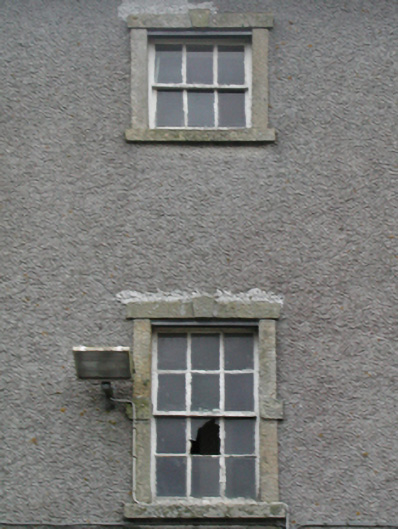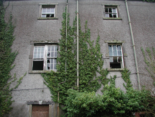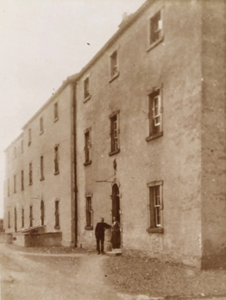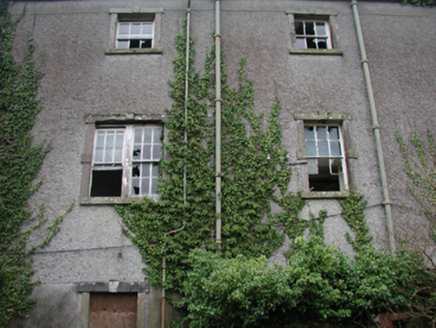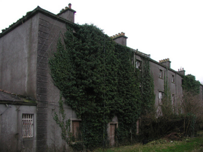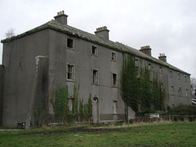 Detached nine-bay three-storey over part basement barrack, built 1801-2, on a symmetrical plan centred on three-bay three-storey breakfront; nine-bay three-storey rear (west) elevation. Repaired, 1837-8. Vacant, 1901; 1911. Now disused. Hipped slate roof on strutted King post timber construction with terracotta ridge tiles, rendered red chimney stacks having cut-granite corbelled stepped chamfered capping supporting terracotta or yellow terracotta tapered pots, and cast-iron rainwater goods on cut-granite eaves retaining cast-iron octagonal or ogee hoppers and downpipes. Part creeper- or ivy-covered roughcast walls on rendered base on lichen-spotted chamfered plinth; roughcast surface finish to rear (west) elevation with rusticated rendered piers to ends. Segmental-headed central door openings with drag edged tooled cut-limestone step thresholds, and cut-granite block-and-start surrounds centred on keystones with fittings boarded-up retaining fanlights. Square-headed window openings with cut-granite sills, and cut-granite block-and-start surrounds centred on keystones framing six-over-six timber sash windows without horns. Square-headed window openings (top floor) with cut-granite sills, and cut-granite block-and-start surrounds centred on keystones framing three-over-three timber sash windows without horns. Square-headed door openings to rear (west) elevation with cut-granite step thresholds, and cut-granite block-and-start surrounds centred on keystones with fittings now boarded-up. Square-headed window openings centred on square-headed window opening in bipartite arrangement (first floor), cut-granite sills, and cut-granite block-and-start surrounds centred on keystones framing six-over-six timber sash windows without horns centred on six-over-six timber sash windows. Square-headed window openings (top floor) with cut-granite sills, and cut-granite block-and-start surrounds centred on keystones framing three-over-three timber sash windows without horns. Set in unkempt grounds with limestone ashlar piers to perimeter having mass-concrete chamfered capping.