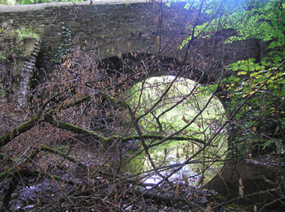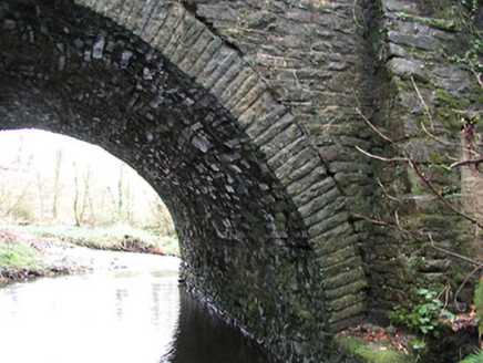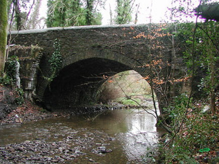 Single-arch rubble stone road bridge over river, c.1825. Random rubble stone walls with rubble stone buttressed piers, and rendered rounded rubble stone coping. Single round arch with dressed rubble stone shallow voussoirs, and rubble stone soffits. Set back from road in grounds originally shared with Castlecomer House sited spanning tributary of Dinin River with grass banks to river.