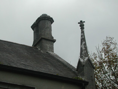 Detached three-bay two-storey Tudor-style national school, c.1825, with single-bay two-storey recessed lower flanking entrance bays. Extensively renovated with some openings remodelled to accommodate residential use. Pitched slate roof with clay ridge tiles, cut-limestone coping to gables having paired limestone ashlar octagonal chimney stacks to apex on cut-limestone base having stringcourse, and iron rainwater goods on rendered eaves. Roofs to entrance bays not visible behind parapets. Unpainted replacement rendered walls with cut-limestone dressings including full-height gabled panelled piers to ends rising to elongated finials, stringcourse to first floor, rectangular recessed panels to first floor entrance bays having carved cut-limestone hood mouldings over, battlemented parapets on stringcourses having coping, and corner finials. Square-headed window openings (originally door opening to one entrance bay remodelled) with cut-limestone sills, carved cut-limestone hood mouldings over, and replacement uPVC casement windows retaining some timber casement windows. Square-headed door openings (originally window opening to centre ground floor remodelled with flight of four steps) with carved cut-limestone surround to end bay, carved cut-limestone hood mouldings over, and timber panelled doors. Set back from road in own grounds with pair of limestone ashlar piers having stringcourses, pyramidal capping, random rubble stone boundary wall to perimeter of site having limestone ashlar piers flanking pedestrian gateway with stringcourses, pyramidal capping, and iron gate.
