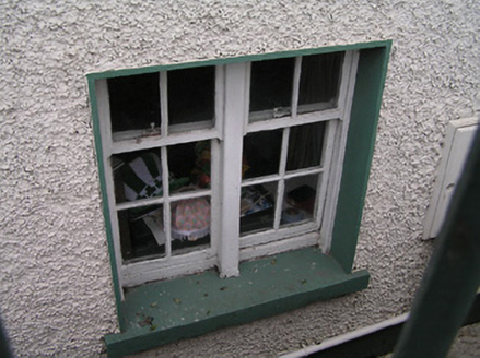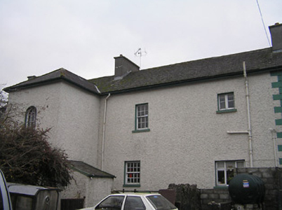 Attached four-bay two-storey over part-raised basement house, c.1825, possibly originally two separate two-bay two-storey houses with single-bay full-height return to north-east. Reroofed, c.1950. Now in use as guesthouse. Pitched roof (hipped to return) with replacement artificial slate, c.1950, clay ridge tiles, rendered chimney stacks, and iron rainwater goods on rendered eaves having iron ties. Unpainted roughcast walls with rendered quoins to ends. Square-headed window openings (some in bipartite arrangement including to basement; round-headed window opening to return) with painted cut-limestone sills, six-over-six timber sash windows having six-over-four timber sash windows to left first floor, two-over-four timber sash windows to basement, and nine-over-six timber sash window to round-headed opening incorporating fanlight. Elliptical headed door opening approached by flight of five cut-limestone steps having iron railings, timber panelled door having sidelights, and fanlight. Interior with timber panelled shutters to window openings. Road fronted with sections of iron railings to front on cut-limestone plinth.