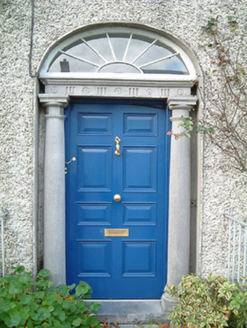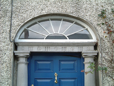 Attached four-bay three-storey house, c.1825. Refenestrated. Pitched slate roof with clay ridge tiles, rendered chimney stacks, and iron rainwater goods on rendered eaves. Unpainted roughcast walls. Square-headed window openings with cut-limestone sills, and replacement uPVC casement windows. Elliptical-headed door opening with limestone ashlar Doric doorcase, and timber panelled door having fanlight. Interior with remains of timber panelled reveals/shutters to window openings. Road fronted with sections of iron railings to front on limestone ashlar plinth having Fleur-de-Lys finials, cut-stone cylindrical piers having capping, and iron gate.