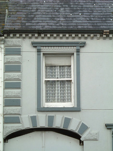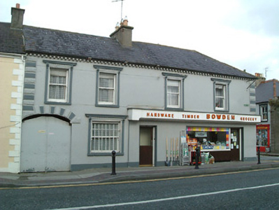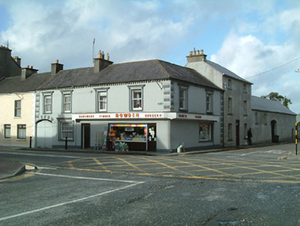 Terraced four-bay two-storey house, c.1900, on a corner site possibly originally two separate two-bay two-storey houses incorporating fabric of earlier range, pre-1840, on site with elliptical-headed carriageway to left ground floor, and two-bay two-storey side (north-east) elevation. Renovated, c.1975, with openings to right ground floor remodelled to accommodate commercial use. Pitched slate roofs on an L-shaped plan (forming hip to corner) with clay ridge tiles, rendered chimney stacks, and cast-iron rainwater goods on rendered eaves having consoles. Painted rendered walls with rendered panelled piers to ends having vermiculated panels. Square-headed window openings with cut-limestone sills, rendered surrounds having consoles supporting dentilated entablatures, and one-over-one timber sash windows (one to ground floor having wrought iron bars). Elliptical-headed carriageway to left ground floor with rendered voussoirs, and iron double doors. Square-headed openings to right ground floor remodelled, c.1975, with fixed-pane timber window, glazed timber panelled doors, projecting fascia/canopy over having raised lettering, and rendered coping. Interior with timber panelled shutters to window openings. Road fronted on a corner site with concrete footpath to front.