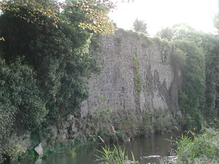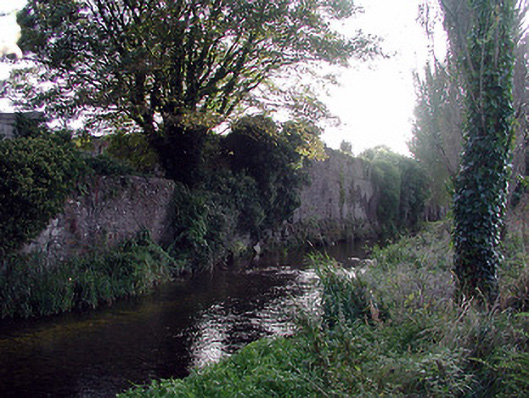 Section of random rubble limestone wall, c.1750, originally forming part of larger composition possibly originally having industrial associations. Remainder of composition demolished, post-1840. Random rubble limestone walls with sections of red brick irregular bond construction having square apertures (possibly originally supporting lean-to roof construction). Camber-headed window openings with no sills, and red brick voussoirs (now blocked-up with random rubble limestone infill). Some square-headed slit-style apertures with no fittings. Round-headed opening possibly originally forming culvert with cut-limestone voussoirs. Set perpendicular to road overlooking Nuenna River with pair of squared rubble limestone piers having rendered pyramidal capping, and iron double gates having spear-head finials.
