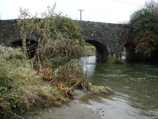 Three-arch rubble limestone road bridge over river, c.1800, on a slightly curved plan. Random rubble limestone walls with cut-stone triangular cut-waters to piers, and squared rubble limestone coping to parapets. Series of three elliptical arches with squared limestone voussoirs, and rubble stone soffits having render over. Sited spanning Munster River (Kilmanagh Branch) at confluence with mill race having grass banks to river.