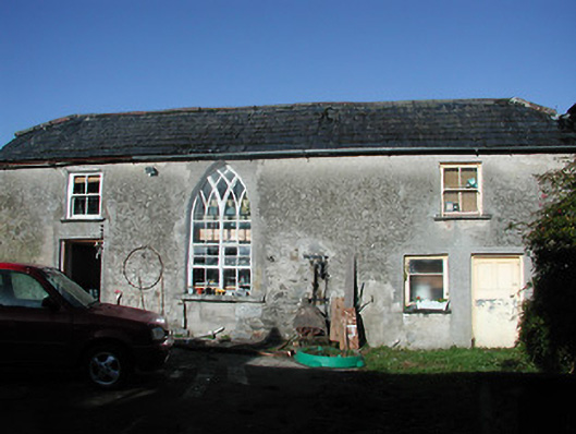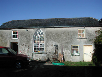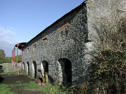 Farmyard complex, c.1825, including: (i) Attached three-bay two-storey outbuilding. Hipped gabled slate roof with terracotta ridge tiles, and cast-iron rainwater goods on rendered eaves. Unpainted rendered walls. Square-headed window openings with cut-limestone sills, and two-over-two timber sash windows. One pointed-arch window opening with cut-limestone sill, and fixed-pane fitting incorporating Y-mullions forming bipartite pointed-arch arrangement having pivot sections. Square-headed door openings with timber panelled doors. (ii) Detached five-bay two-storey rubble stone outbuilding with series of five elliptical-headed carriageways to ground floor. Reroofed, c.1975. Pitched roof with replacement corrugated-iron, c.1975, clay ridge tiles, and no rainwater goods surviving on rendered eaves. Random rubble limestone walls. Square-headed window openings with no sills, and red brick solider course voussoirs (now blocked-up with random rubble limestone infill). Series of five elliptical-headed carriageways to ground floor with rubble limestone voussoirs, and wrought iron fittings.