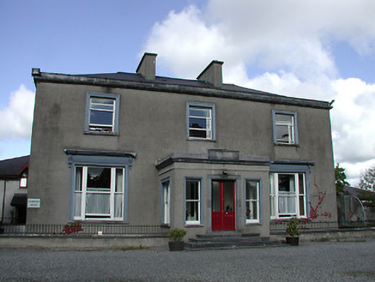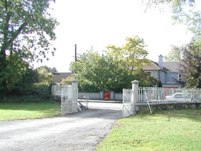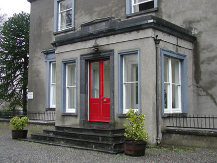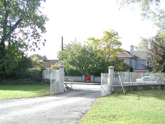 Attached three-bay two-storey over basement Classical-style house, c.1875, originally detached on a symmetrical plan with three-bay single-storey flat-roofed projecting porch to centre ground floor, and three-bay two-storey side elevations. Converted to use as school, 1973. Hipped slate roof behind parapet with clay ridge tiles, rendered chimney stacks, and concealed cast-iron rainwater goods. Flat roof to porch not visible behind parapet. Unpainted rendered, ruled and lined walls with carved cut-limestone cornice supporting blocking course to parapet having cut-limestone coping, and rendered band to porch supporting carved cut-limestone cornice having cut-limestone blocking course over with inscribed central panel. Square-headed window openings (in tripartite arrangement to ground floor having inscribed mullions) with cut-limestone sills, moulded rendered surrounds to front (south) elevation having entablatures over to tripartite openings on consoles, and one-over-one timber sash windows having one-over-one sidelights to tripartite openings. Square-headed door opening to porch with four cut-limestone steps, carved cut-limestone surround, and glazed timber panelled double doors. Interior with timber panelled shutters to window openings. Set back from road in own grounds with unpainted rendered plinth to basement having cut-limestone coping supporting wrought iron railings, gravel forecourt, and remains of landscaped grounds to site including sunken garden having flight of cut-limestone steps. (ii) Gateway, c.1875, to west comprising pair of cut-granite cylindrical piers with cut-granite conical capping, iron double gates, painted rendered curved flanking walls having cut-stone coping supporting wrought iron railings, and cut-granite panelled terminating piers having cut-granite capping.