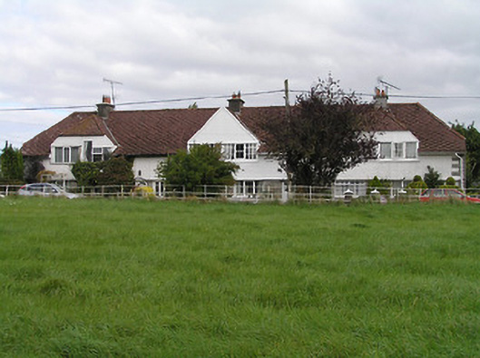 End-of-terrace two-bay single-storey Arts-and-Crafts-style house with dormer attic, built 1903, originally thatched. Reroofed, c.1950. Refenestrated. One of a group of six. Hipped gabled (shared) roof (hipped gabled (shared) to half-dormer attic window) with replacement clay tile, c.1950, laid in diagonal courses, terracotta ridge tiles, rendered (shared) chimney stack, slightly sproketed eaves, and cast-iron rainwater goods on slightly overhanging eaves. Rock-faced cut-limestone walls to ground floor with painted roughcast walls over having rock-faced cut-limestone quoins to corner. Square-headed window openings (some possibly remodelled) with cut-limestone shallow sills, and replacement uPVC casement windows. Square-headed door opening with glazed timber panelled door. Set back from line of road with wrought iron railings to perimeter of site.