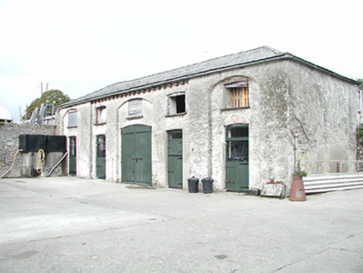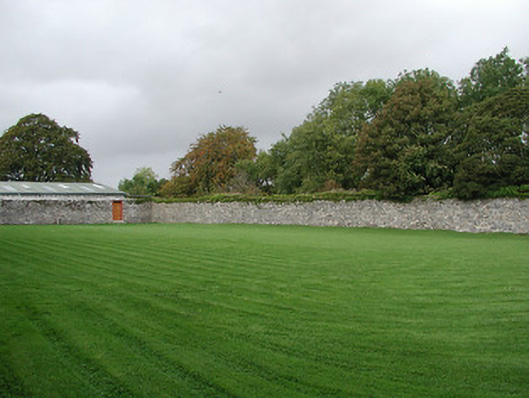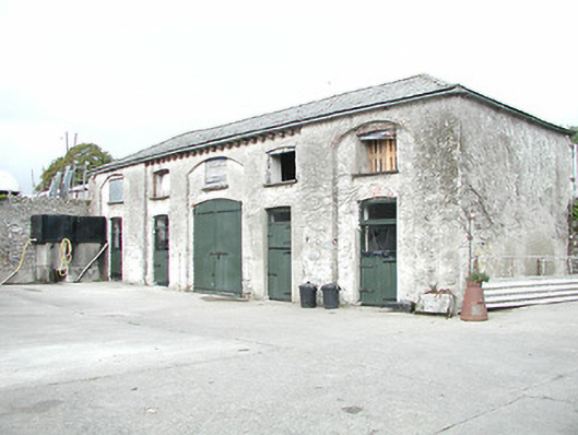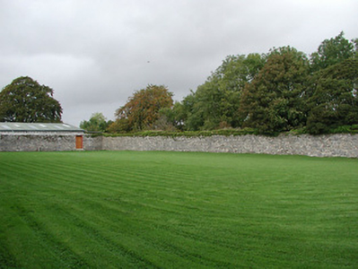 Farmyard complex, c.1900, possibly incorporating fabric of earlier ranges, pre-1840, on site including: (i) Detached five-bay two-storey stable building on a symmetrical plan with three-bay two-storey central recess having camber-headed carriageway to centre ground floor. Hipped slate roof with clay ridge tiles, slightly sproketed eaves, and iron rainwater goods on rendered eaves having red brick consoles to central bays. Unpainted roughcast walls with camber-headed full-height recesses having roughcast red brick voussoirs. Square-headed window openings in camber-headed recesses with cut-stone sills, concealed red brick voussoirs, and remains of timber fittings. Camber-headed door openings with concealed red brick voussoirs, and tongue-and-groove timber panelled half-doors having overlights. Camber-headed carriageway to centre ground floor with concealed red brick voussoirs, and iron double doors. (ii) Walled garden on a rectangular plan with random rubble limestone boundary wall to perimeter incorporating square-headed door opening with red brick block-and-start surround, and timber panelled door. (iii) Detached two-bay two-storey farm manager's house with two-bay single-storey wing to right. Extensively renovated. Hipped roof to main block and pitched roof to wing with replacement artificial slate, clay ridge tiles, slightly sproketed eaves to main block, and replacement uPVC rainwater goods on rendered eaves. Ivy-clad unpainted roughcast walls with cut-limestone quoins to corners, and rendered band to eaves. Square-headed window openings in camber-headed recesses with concealed sills, rendered surrounds, and replacement uPVC casement windows. Camber-headed door opening with rendered block-and-start surround, and timber panelled door having fanlight.