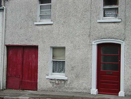 Attached four-bay two-storey double-pile house, c.1850, with square-headed carriageway to left ground floor. Pitched double-pile (M-profile) slate roof with clay ridge tiles, rendered chimney stacks, rendered coping, and iron rainwater goods on rendered eaves. Unpainted roughcast walls. Square-headed window openings with cut-limestone sills, and one-over-one timber sash windows. Camber-headed door opening with moulded surround, and replacement glazed timber panelled door, c.1950. Square-headed carriageway to left ground floor with timber boarded double doors. Interior with timber panelled reveals/shutters to window openings. Road fronted with concrete footpath to front.
