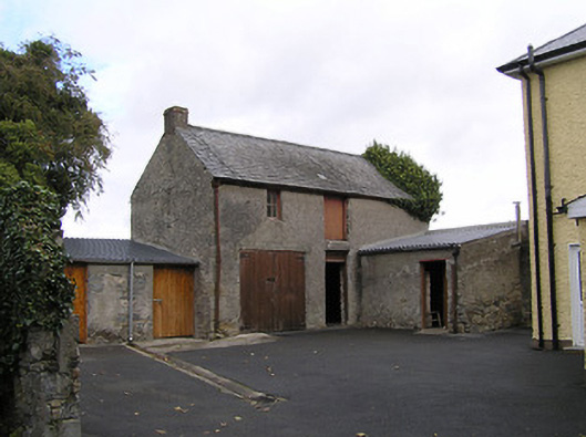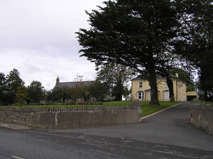 Detached three-bay two-storey parochial house, c.1900, with single-bay single-storey projecting porch to centre ground floor having flanking canted bay windows. Hipped slate roof (hipped to porch) with clay ridge tiles, rendered chimney stacks, and cast-iron rainwater goods on rendered stepped eaves. Painted roughcast walls with painted rendered strips to corners. Square-headed window openings (including to canted bay windows) with painted cut-stone sills, and one-over-one timber sash windows. Square-headed door opening with timber panelled door. Interior with timber panelled shutters to window openings. Set back from road in own grounds on an elevated site with landscaped grounds to site having random rubble stone boundary wall to perimeter with squared limestone 'battlemented' coping. (ii) Detached two-bay two-storey outbuilding, c.1900, to north with square-headed carriageway to left ground floor, single-bay single-storey mono-pitched projecting bay to right, and two-bay single-storey mono-pitched wing to left. Part reroofed. Pitched slate roof with clay ridge tiles, red brick Running bond chimney stack, and cast-iron rainwater goods on rendered eaves. Mono-pitched roofs with replacement corrugated-iron, and cast-iron rainwater goods. Unpainted roughcast walls over random rubble stone construction. Square-headed window opening with no sill, and timber casement window. Square-headed door openings (including one to right first floor) with timber boarded doors. Square-headed carriageway to left ground floor with timber boarded double doors.