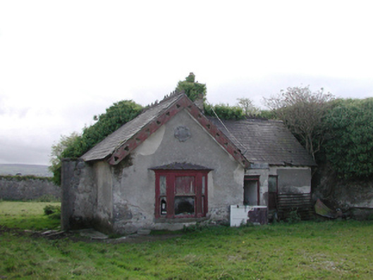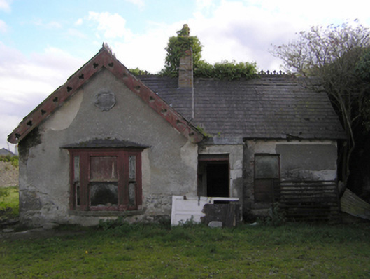 Detached three-bay single-storey worker's house, extant 1900, on an L-shaped plan centred on single-bay single-storey flat-roofed projecting porch abutting single-bay single-storey gabled projecting end bay. Now disused. Pitched slate roof on an L-shaped plan centred on flat roof (porch), "Fleur-de-Lys"-crested roll moulded clay ridge tiles, yellow brick Running bond off-central chimney stack on yellow brick Running bond base having overgrown capping supporting louvered terracotta or yellow terracotta tapered pots, trefoil-perforated timber bargeboards to gable on timber purlins, and no rainwater goods surviving on exposed timber rafters. Rendered coursed rubble limestone walls with concealed flush quoins to corners. Square-headed central door opening with concealed dressings framing remains of timber fitting having overlight. Square-headed window openings with cut-granite sills, and concealed red brick block-and-start surrounds framing one-over-one timber sash windows. Set in unkempt grounds shared with Gowran Castle.