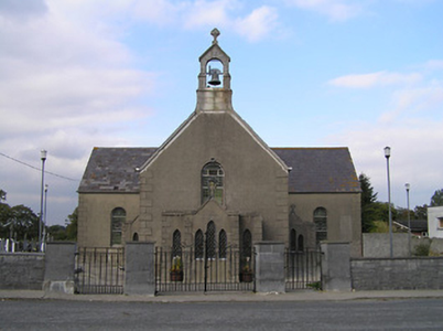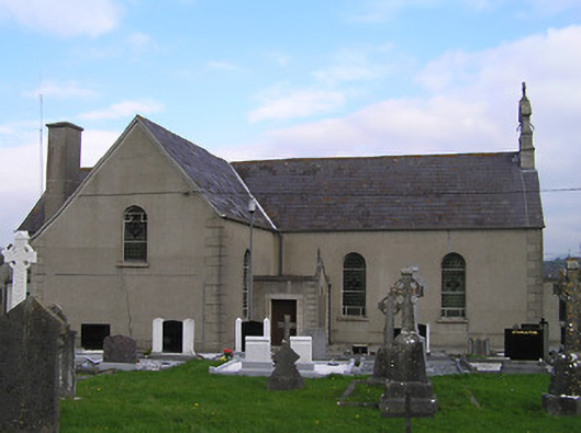 Detached four-bay double-height Catholic church, built 1813, on a cruciform plan comprising two-bay double-height nave with single-bay double-height transepts to east and to west, and single-bay double-height chancel to north having single-bay single-storey lean-to sacristy to north-east. Renovated, 1930, with single-bay single-storey flat-roofed projecting porches added to front (south) elevation and to front (south) elevations of transepts. Pitched slate roofs on a cruciform plan (lean-to to sacristy) with clay ridge tiles, granite ashlar buttressed gabled bellcote to gable to south (with round-headed aperture having bronze bell, and cut-granite coping to gable having cross finial to apex), and cast-iron rainwater goods on rendered eaves. Flat roofs to porches not visible behind parapets. Unpainted rendered, ruled and lined walls with rendered quoins to corners, and rendered coping to parapets to porches extending into gables having cross finials to apexes. Round-headed window openings with rendered sills, and fixed-pane fittings having leaded stained glass panels. Lancet window openings to porch (some grouped in tripartite arrangement) with concrete sills, and fixed-pane fittings having diamond-leaded or lattice panels. Segmental-headed door opening to porch with square-headed door openings to porches to transepts having tongue-and-groove timber panelled double doors. Full-height interior open into roof with timber panelled confessional boxes having engaged colonettes supporting profiled friezes, balustraded galleries to first floor on cast-iron pillars, and exposed timber roof construction having tongue-and-groove timber panelled ceiling. Set back from road in own grounds with unpainted roughcast boundary wall to perimeter of site over concrete block construction having unpainted cement rendered piers, wrought iron gates and double gates. (ii) Graveyard to site with various cut-stone markers, post-1813-present. (iii) Nuns' graveyard to site with various cast-iron markers, post-1858-present.