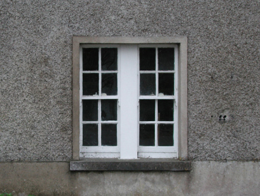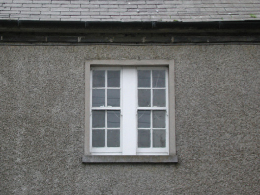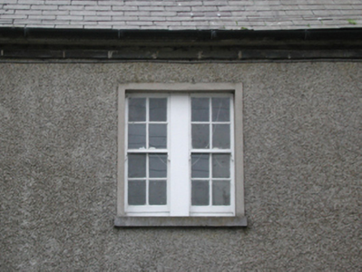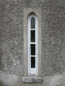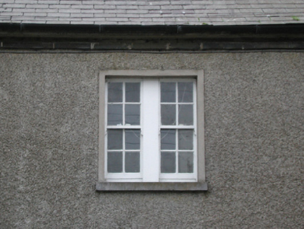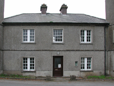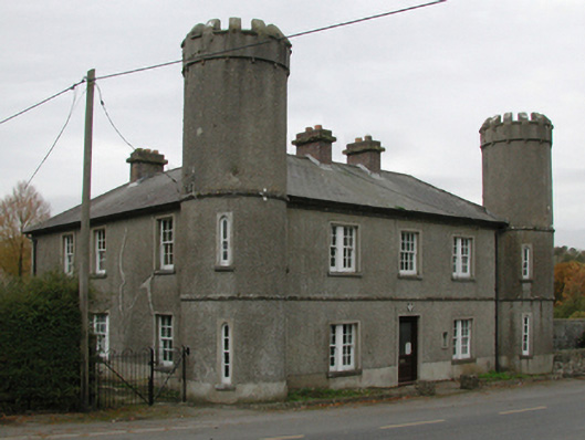 Detached three-bay two-storey Garda Síochána station, built 1927, on an L-shaped plan with single-bay three-stage turrets on circular plans; three-bay (east) or single-bay (west) two-storey side elevations. Hipped slate roof on an L-shaped plan with lichen-spotted clay ridge tiles, paired red brick Running bond central chimney stacks having stringcourses below capping supporting terracotta pots, and cast-iron rainwater goods on box eaves retaining cast-iron downpipes. Roughcast walls on rendered plinth including roughcast walls (turrets) with rendered battlemented parapets on dentil corbels; part creeper- or ivy-covered roughcast surface finish (remainder) on rendered plinth. Square-headed central door opening with concrete threshold, and rendered "bas-relief" surround framing replacement glazed timber panelled door. Square-headed window openings in bipartite arrangement centred on square-headed window opening (first floor), cut-granite sills, timber mullions, and rendered "bas-relief" surrounds framing four-over-four timber sash windows centred on eight-over-eight timber sash window. Lancet window openings (turrets) with cut-granite sills, and rendered "bas-relief" surrounds framing two-over-two timber sash windows having part exposed sash boxes. Square-headed window openings (remainder) with cut-granite sills, and rendered "bas-relief" surrounds framing six-over-six timber sash windows. Road fronted.
