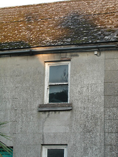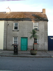 Attached three-bay two-storey house, c.1925. Now disused. Pitched (shared) artificial slate roof with clay ridge tiles, rendered chimney stacks, and iron rainwater goods on rendered eaves. Unpainted rendered, ruled and lined walls with rendered channelled piers to ends. Square-headed window openings with cut-stone or concrete sills, inscribed voussoirs, and one-over-one timber sash windows. Square-headed door opening with timber panelled door. Road fronted with concrete footpath to front.