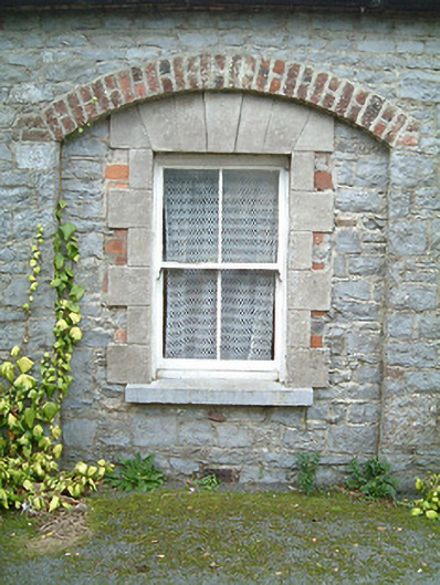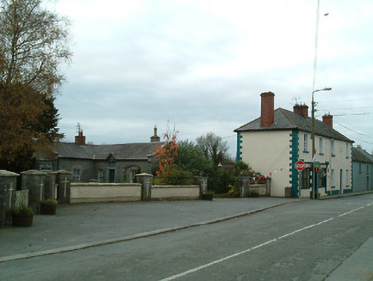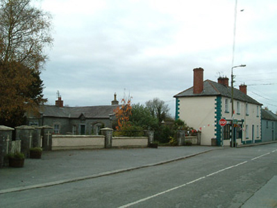 Detached three-bay single-storey Tudor-style building, c.1850, on an L-shaped plan possibly originally school or presbytery/rectory with single-bay single-storey mono-pitched projecting bay to left. Now in residential use. Pitched slate roof (gablet over door opening; mono-pitched to projecting bay) with clay ridge tiles, rendered and red brick Running bond chimney stacks, cut-stone coping to gables, and iron rainwater goods on squared rubble stone eaves. Random rubble stone walls (probably originally rendered) with rectangular recessed panel under gablet, and cut-stone shield panel to gable to side (north) elevation. Square-headed window openings (one in segmental-headed recess having red brick voussoirs) with cut-stone sills, rendered block-and-start surrounds over red brick block-and-start surrounds having keystones, and two-over-two timber sash windows. Square-headed door opening with cut-limestone surround having chamfered reveals, and timber panelled door. Set back from line of road in own grounds perpendicular to road.