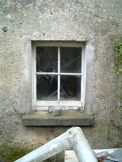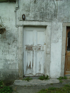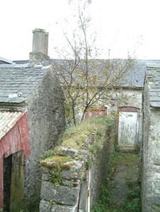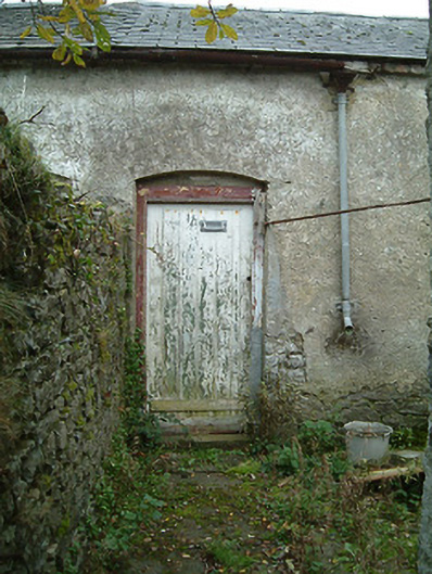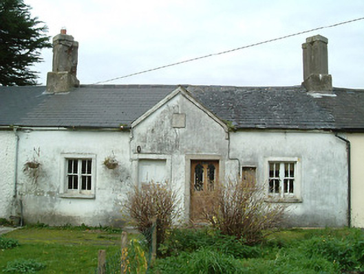 Terraced two-bay single-storey house, c.1825, with single-bay single-storey shared gabled entrance bay to right. Reroofed. Now disused. One of a terrace of five forming part of a group of ten. Pitched roof (gabled to entrance bay) with replacement artificial slate, clay ridge tiles, rendered chimney stack having paired diagonal flues, rendered bargeboards to gable, and remains of cast-iron rainwater goods on rendered eaves. Painted rendered walls over random rubble stone construction with shared rendered panel to gable. Square-headed window opening in bipartite arrangement with cut-stone sill, rendered surround, and two-over-two timber sash windows. Square-headed door opening with rendered surround, and timber panelled door. Square-headed door opening to rear (north) elevation in camber-headed recess with timber boarded door. Set back from road in shared grounds with shared forecourt. (ii) Detached single-bay single-storey outhouse, c.1825, to north. Pitched slate roof with clay ridge tiles, and no rainwater goods on rendered squared rubble stone eaves. Painted rendered walls over random rubble stone construction. Openings not visible.