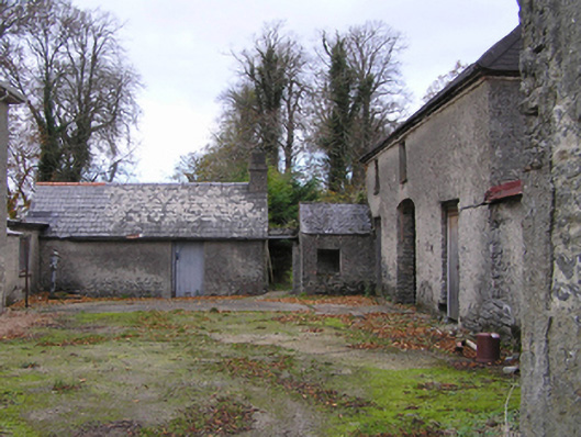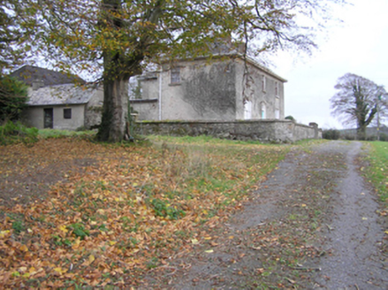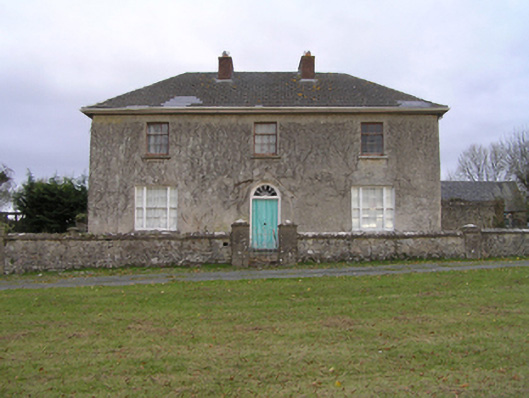 Detached three-bay two-storey Board of First Fruits Church of Ireland glebe house, built 1813, on an L-shaped plan; single-bay (north) or two-bay (south) two-storey side elevations. Occupied, 1901; 1911. Reroofed, ----. Now disused. Replacement hipped fibre-cement slate roof on an L-shaped plan with lichen-covered clay ridge tiles, paired red brick Running bond central chimney stacks having capping supporting terracotta pots, and uPVC rainwater goods on slightly overhanging timber boarded box eaves retaining some cast-iron downpipes. Part creeper-covered fine roughcast coursed or snecked limestone walls with concealed cut-limestone flush quoins to corners. Segmental-headed central door opening with step threshold, and concealed red brick block-and-start surround framing timber panelled door having fanlight. Square-headed flanking window openings in tripartite arrangement with drag edged dragged cut-limestone sills, timber mullions, and concealed red brick block-and-start surrounds framing six-over-six timber sash windows having two-over-two sidelights. Square-headed window openings (first floor) with drag edged dragged cut-limestone sills, and concealed red brick block-and-start surrounds framing three-over-six timber sash windows. Interior including (ground floor): central hall retaining carved timber surrounds to door openings framing timber panelled doors; and carved timber surrounds to door openings to remainder framing timber panelled doors with timber panelled shutters to window openings. Set in unkempt grounds with rendered, ruled and lined piers to "cottage garden" having lichen-covered pyramidal capping supporting arrow head-detailed looped wrought iron gate.