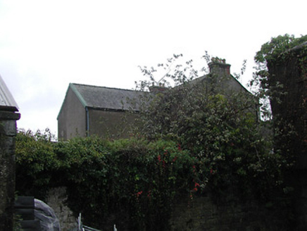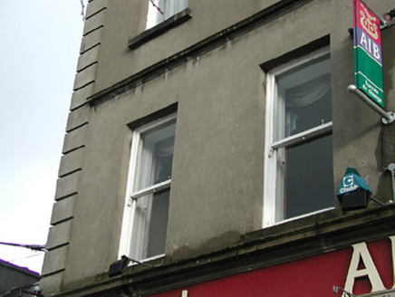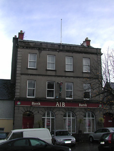 Terraced four-bay three-storey Classical-style bank, c.1900, on a T-shaped plan with single-bay three-storey return to east. Pitched slate roof on a T-shaped plan behind parapet with clay ridge tiles, red brick Running bond and rendered chimney stacks, rendered coping, and cast-iron rainwater goods. Unpainted rendered walls with channelling to ground floor having frieze over on moulded stringcourse, moulded cornice, channelled piers to ends to upper floors, stringcourse to second floor, and moulded rendered cornice supporting parapet having rendered coping. Round-headed openings to ground floor with moulded rendered sills forming sill course, rendered channelled voussoirs, fixed-pane (three-light) timber windows having iron sill guards, and timber panelled door on cut-limestone step having overlight. Square-headed window openings to upper floors with cut-limestone sills, and one-over-one timber sash windows. Interior with timber panelled shutters to window openings. Set back from line of road with tarmacadam forecourt. (ii) Gateway, c.1900, to south comprising round-headed carriageway with unpainted rendered channelled piers, channelled voussoirs, timber panelled double doors having wicket gate, frieze on moulded stringcourse, and moulded cornice supporting blocking course to parapet.