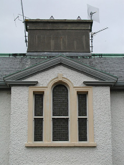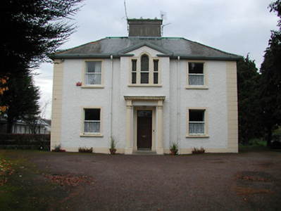 Detached three-bay two-storey parochial house, c.1900, with single-bay two-storey pedimented breakfront. Hipped slate roof (gabled to breakfront) with rolled copper and clay ridge tiles, rendered chimney stack on axis with ridge, and cast-iron rainwater goods on rendered eaves. Painted roughcast walls with rendered channelled piers to corners, and moulded rendered surround to breakfront forming open-bed pediment. Square-headed window openings (Venetian window opening to first floor breakfront) with rendered sills, rendered surrounds (moulded rendered surround to Venetian opening having keystone), and one-over-one timber sash windows having leaded panels to Venetian opening. Square-headed door opening with cut-limestone step, rendered Doric doorcase having engaged columns, frieze supporting entablature, rendered surround, and timber panelled door having overlight. Interior with timber panelled reveals/shutters to window openings. Set back from road in own grounds with painted rendered boundary wall having painted rendered panelled piers with moulded cornices supporting rendered capping, and iron double gates. (ii) Detached three-bay single-storey barrel-roofed outbuilding with attic, c.1925, with square-headed carriageway to right. Barrel-vaulted corrugated-iron roof with iron rainwater goods on rendered eaves. Unpainted rendered walls. Square-headed window openings with concrete sills, and one-over-one timber sash windows. Square-headed door opening with tongue-and-groove timber panelled half-door. Square-headed carriageway to right with replacement iron lifting door, c.1975.