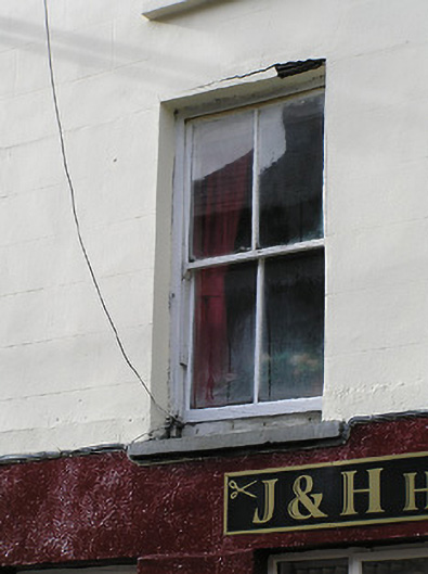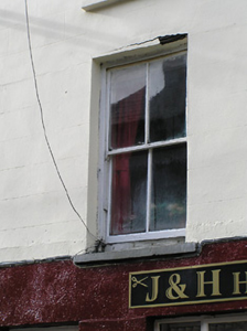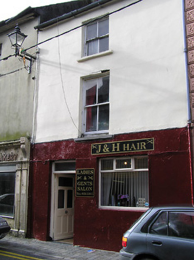 Terraced single-bay three-storey house, c.1825. Refenestrated, c.1925. Renovated with opening to ground floor remodelled to accommodate commercial use. Now disused to upper floors. One of a terrace of four. Pitched (shared) slate roof with clay ridge tiles, red brick Running bond squat (shared) chimney stacks, and iron rainwater goods on rendered eaves having iron ties. Painted rendered, ruled and lined wall. Square-headed window openings with cut-stone sills, and replacement two-over-two timber sash windows, c.1925. Square-headed window opening to ground floor remodelled with fixed-pane timber window having casement section. Square-headed door opening with replacement glazed timber panelled door, c.1950, having overlight. Road fronted with concrete brick cobbled footpath to front.