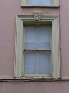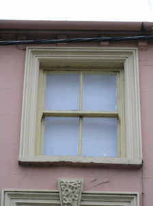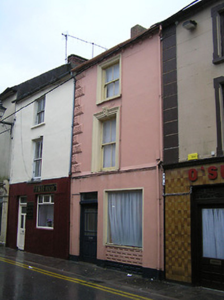 Terraced single-bay three-storey house, c.1825. Extensively renovated, c.1925, with render façade enrichments added. Renovated, c.1975, with opening to ground floor remodelled to accommodate commercial use. Now disused. One of a terrace of four. Pitched (shared) slate roof with clay ridge tiles, red brick Running bond squat (shared) chimney stacks, and iron rainwater goods on rendered eaves having rendered consoles, c.1925. Painted rendered, ruled and lined wall with vermiculated rendered quoins, c.1925, to end. Square-headed window openings with cut-stone sills, moulded rendered surrounds, c.1925, having keystone to first floor, and replacement two-over-two timber sash windows, c.1925. Square-headed window opening to ground floor remodelled, c.1975, with fixed-pane timber window on painted brick stall riser. Square-headed door opening with replacement glazed timber panelled door, c.1975, having overlight. Road fronted with concrete brick cobbled footpath to front.