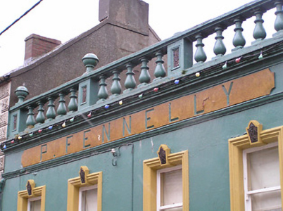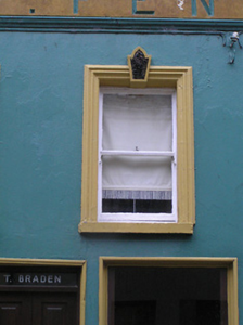 Terraced four-bay two-storey house, c.1825, with square-headed carriageway to right ground floor. Renovated, c.1900, with render façade enrichments added. Renovated, c.1975, with openings to ground floor remodelled to accommodate commercial use. Now entirely in residential use. Roof not visible behind parapet with cast-iron rainwater goods. Painted rendered walls with rendered dressings, c.1900, including inscribed fascia to top floor between stringcourses, moulded cornice, and balustraded parapet having panelled pedestals supporting finials. Square-headed window openings with cut-stone sills, moulded rendered surrounds, c.1900, having keystones, and replacement one-over-one timber sash windows, c.1900. Square-headed door opening with replacement timber panelled door, c.1975, having overlight. Square-headed openings to ground floor remodelled, c.1975, with fixed-pane timber windows, and timber panelled double doors having overlights. Square-headed carriageway to right ground floor with rounded wheelguards, and timber panelled double doors. Road fronted with concrete brick cobbled footpath to front.