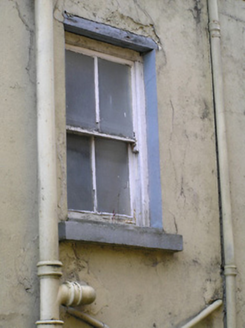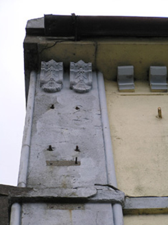 Attached three-bay three-storey house, c.1825. Renovated, c.1875, with shopfront inserted to ground floor. Extensively renovated, c.1950, with frontage remodelled to accommodate use as guesthouse. Refenestrated, c.1975. Now disused to right ground floor. Pitched slate roof with clay ridge tiles, rendered chimney stacks having corbel tables, rendered coping, and cast-iron rainwater goods on rendered eaves having corbel table. Painted rendered walls with rendered piers to corners having moulded reveals, rendered stringcourses to each floor, and rendered surrounds to gables on corbel tables. Square-headed window openings with rendered sills forming sill courses, and replacement timber casement windows, c.1975, retaining one-over-one timber sash window to side (south-west) elevation. Reconstituted limestone shopfront, c.1950, to right ground floor having terrazzo threshold with panelled piers sweeping into consoles (responsive pier to left ground floor), fixed-pane timber windows, replacement glazed timber panelled door, c.1975, raised lettering, and projecting course over. Road fronted at junction of two roads with concrete footpath to front.