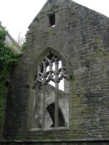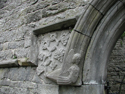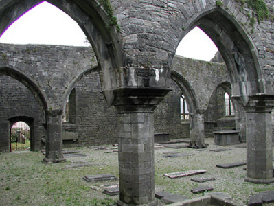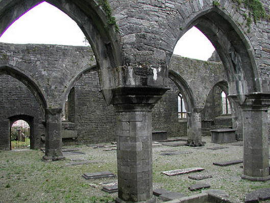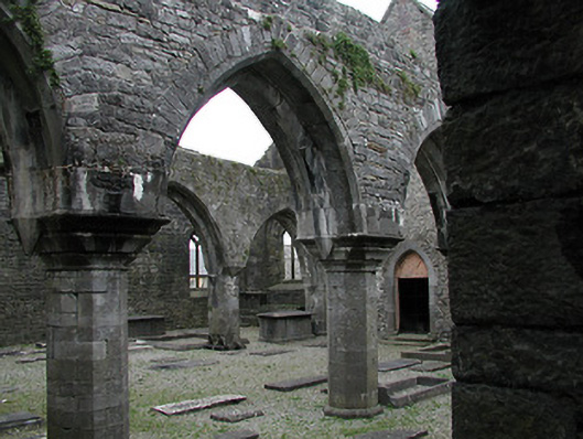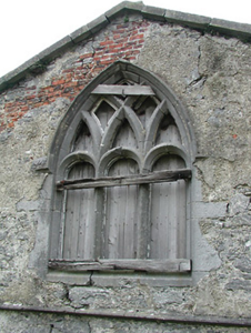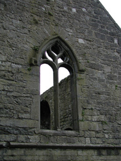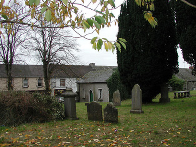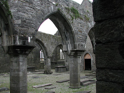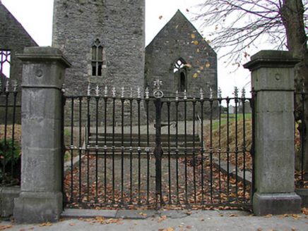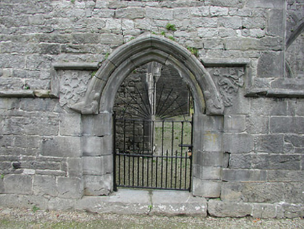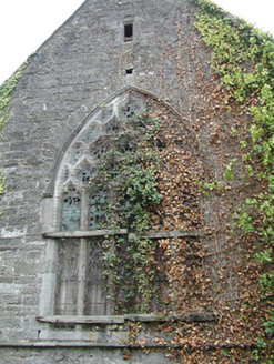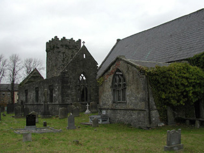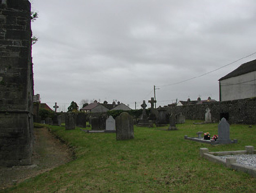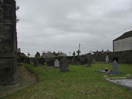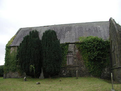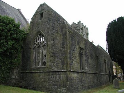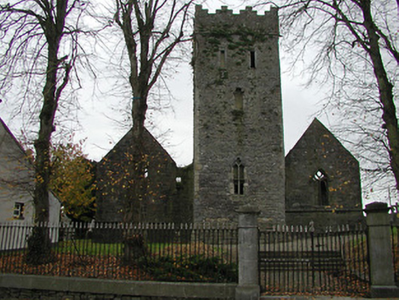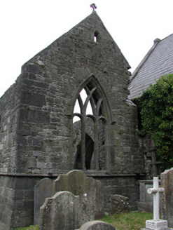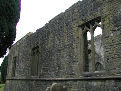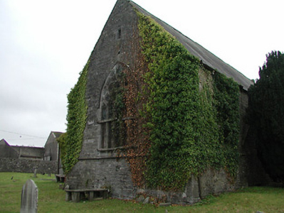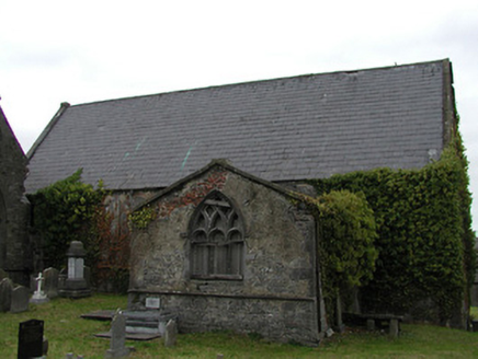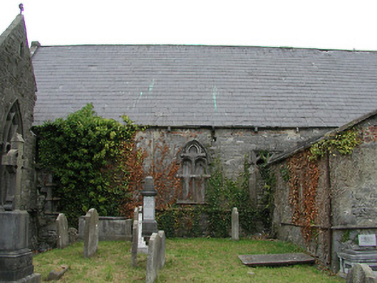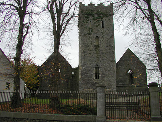 Detached seven-bay double-height rubble stone medieval parish church, built 1460, possibly incorporating fabric of earlier church, c.1250, comprising three-bay double-height nave with four-bay double-height chancel to east having single-bay double-height lower vestry to south, and single-bay three-stage tower, c.1250, to west on a square plan. Completed, 1530, with three-bay double-height side aisles added to north and to south. Renovated, pre-1837, with chancel converted to use as Church of Ireland church. Closed, pre-1973. Now disused with nave and side aisles now in ruins. Pitched slate roof to chancel (pitched slate roof to vestry) with clay ridge tiles, cut-stone coping to gables, and cast-iron rainwater goods on squared rubble limestone eaves having cut-limestone corbels. Pitched roofs to remainder now gone with roof to tower not visible behind parapet. Random rubble limestone walls (traces of unpainted roughcast over to vestry having sections of red brick irregular bond construction to gable) with slight plinth batter, cut-limestone stringcourse over, dressed stone quoins to corners, cut-limestone coping to gables having remains of cross finials to apexes, and Irish battlemented parapet to tower on cut-stone stringcourse. Pointed-arch window openings to chancel with cut-limestone surrounds having chamfered reveals, hood mouldings over, Y-mullions forming bipartite elliptical-headed arrangement having pierced oval over to arch (now boarded-up). Pointed-arch window opening to east with cut-limestone surround having chamfered reveals, hood moulding over supporting squared limestone voussoirs, Y-mullions and tracery forming five-part trefoil-headed arrangement having pierced quatrefoils over to arch (now boarded-up with remains of fixed-pane fittings surviving having leaded panels). Pointed-arch window opening to vestry with cut-limestone surround having chamfered reveals, hood moulding over, Y-mullions and tracery forming tripartite elliptical-headed arrangement having overlights (now boarded-up). Paired trefoil-headed window openings to first stage to tower with quatrefoil opening over, cut-limestone surround having chamfered reveals, and no fittings surviving. Square-headed window openings to remainder with cut-limestone surrounds having chamfered reveals, and no fittings surviving. Square-headed window openings to side aisles with cut-limestone surrounds having chamfered reveals, hood mouldings over, Y-mullions and tracery forming bipartite ogee-headed (south) and cinquefoil-headed (north) arrangement, and no fittings surviving. Pointed-arch window openings to west and to east elevations with cut-limestone surrounds having chamfered reveals, hood mouldings supporting squared limestone voussoirs, Y-mullions and tracery forming bipartite (west) and tripartite (east) elliptical- (south) and cinquefoil-headed (north) arrangements having overlights, and no fittings surviving. Pointed-arch door opening into chancel with cut-limestone step, cut-limestone surround having chamfered reveals, and wrought iron gate retaining Gothic-style timber overpanel. Interior to nave with pointed-arch arcade on limestone ashlar octagonal piers having moulded capping, and limestone ashlar soffits having chamfered reveals. Set back from road in own grounds. (ii) Graveyard to site with various cut-stone markers, pre-1530-post-1977. (iii) Gateway, c.1800, to west comprising pair of limestone ashlar piers with frieze between courses supporting carved cornices having cut-limestone capping, wrought iron double gates having cast-iron finials, sections of wrought iron flanking railings on limestone ashlar chamfered plinth having cast-iron finials, limestone ashlar outer piers with friezes between courses supporting carved cornices having cut-limestone capping, and random rubble stone boundary wall to perimeter of site.