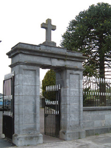 Gateway, built 1854, comprising pair of square-headed pedestrian gateways flanking central gateway with limestone ashlar panelled piers having moulded courses supporting frieze incorporating keystone, moulded cornice, blocking course with central cross finial, iron gates and double gates having cast-iron foliate finials, and sections of iron railings on limestone ashlar plinths terminating in limestone ashlar panelled piers. Road fronted at entrance to grounds of the Catholic Church of the Assumption.