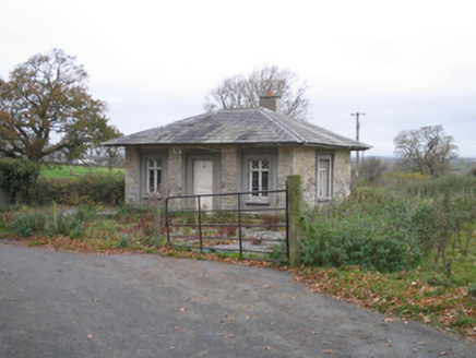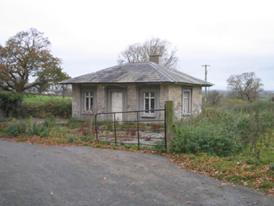 Detached three-bay single-storey gate lodge, extant 1839, on a symmetrical plan; single-bay single-storey side elevations. Occupied, 1901; 1911. Now disused. Hipped slate roof with pressed or rolled lead ridges, cement rendered central chimney stack having concrete capping supporting terracotta pot, and no rainwater goods surviving on timber eaves boards on overhanging eaves. Coursed rubble limestone walls originally rendered with hammered limestone flush quoins to corners. Square-headed central door opening in square-headed recess with rendered surround framing timber panelled door. Square-headed flanking window openings in square-headed recesses with cut-limestone sills, and rendered surrounds framing timber casement windows having horizontal glazing bars. Set back from line of road at entrance to grounds of The Priory.