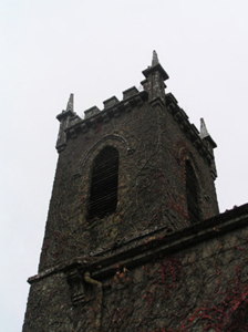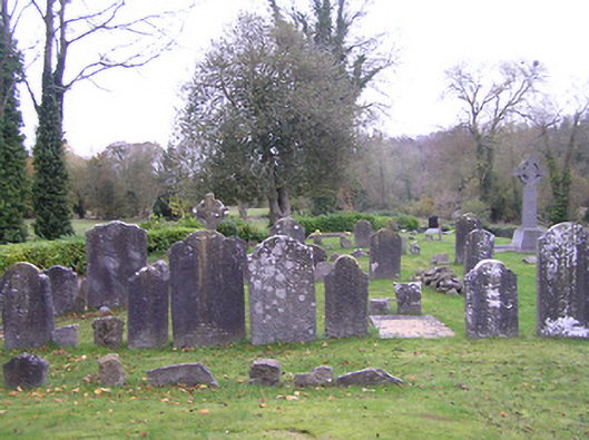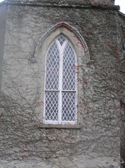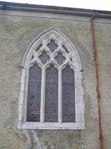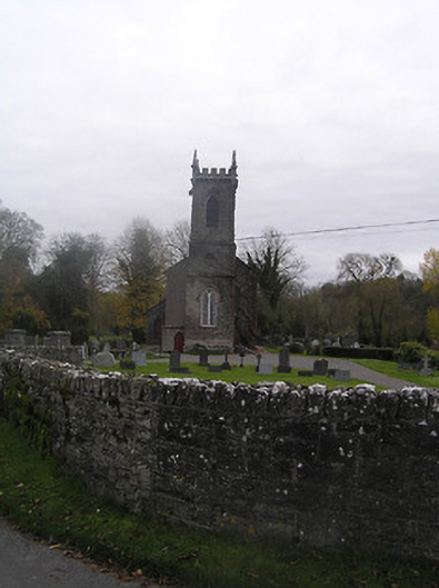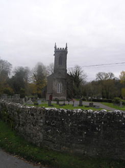 Detached three-bay double-height over part-basement single-cell Board of First Fruits Church of Ireland church, built 1815, with single-bay single-storey lean-to vestry to north-east, and single-bay three-stage entrance tower to west on a square plan having single-bay single-storey flanking bay to north. Renovated, c.1850. Pitched and hipped slate roof (lean-to to vestry) with terracotta ridge tiles, cut-limestone coping, and cast-iron rainwater goods on cut-limestone eaves. Roof to tower not visible behind parapet. Part ivy-clad unpainted roughcast walls over random rubble limestone construction with cut-limestone dressings including stringcourses to each stage to tower, quatrefoil panels to second stage having cut-limestone surrounds, battlemented parapet on corbelled stringcourse having panelled corner finials rising to obelisk pinnacles, and irregular coursed tooled cut-limestone walls to vestry. Pointed-arch window openings with cut-limestone block-and-start surrounds having chamfered reveals, hood mouldings over, Y-mullions forming bipartite pointed-arch arrangement having decorative overlights, and fixed-pane fittings having leaded stained glass panels. Pointed-arch window opening to east with cut-granite surround, c.1850, having chamfered reveals, hood moulding over, Y-mullions and tracery forming tripartite trefoil-headed arrangement having pointed quatrefoils over, and fixed-pane fittings having leaded stained glass panels. Pointed-arch window opening to first stage to tower with cut-limestone sill, hood moulding over, Y-mullion forming bipartite pointed-arch arrangement, and fixed-pane timber windows having lattice glazing. Pointed-arch openings to top (bell) stage to tower with no sills, concealed red brick dressings, hood moulding over, and louvered panel fittings. Tudor-headed door opening to tower with four cut-limestone steps, cut-limestone surround having chamfered reveals, hood moulding over, and tongue-and-groove timber panelled double doors having overpanel. Pointed-arch door opening to flanking bay with tongue-and-groove timber panelled door. Square-headed door opening to basement with tooled cut-limestone voussoirs, and timber boarded door. Pointed-arch window openings to vestry with tooled cut-limestone surrounds having chamfered reveals, and fixed-pane iron fittings having lattice glazing. Profiled square-headed door opening with three cut-limestone steps, cut-limestone surround having chamfered reveals, and tongue-and-groove timber panelled door. Set back from road in own grounds with irregular coursed dressed rubble stone boundary wall to perimeter of site having squared rubble stone coping, tooled limestone ashlar piers having cut-limestone capping, and iron double gates. (ii) Graveyard to site with various cut-stone markers, 1834-present.