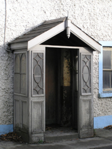 Attached three-bay single-storey house with dormer attic, c.1850. Renovated, c.1900, with single-bay single-storey gabled advanced open porch added to centre. Pitched (shared) slate roof (gabled to porch) with clay ridge tiles, red and yellow brick Running bond chimney stacks, rendered coping to party wall, timber bargeboards to porch having finial to apex, and cast-iron rainwater goods. Painted roughcast walls. Square-headed window openings with cut-stone sills, rendered surrounds, and two-over-two timber sash windows. Square-headed door opening under open porch (with fixed-pane timber windows on panelled risers) with timber boarded door. Road fronted with concrete footpath to front.