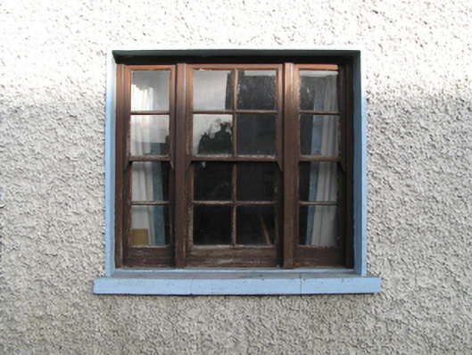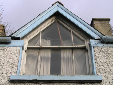 Attached single-bay single-storey house with half-dormer attic, c.1850. Reroofed, c.1950. Pitched (shared) roof (gabled to half-dormer attic window) with replacement artificial slate, c.1950, clay ridge tiles, yellow brick Running bond and roughcast chimney stacks, rendered coping to party wall, and cast-iron rainwater goods on rendered eaves. Painted roughcast walls with rendered strips to ends. Square-headed window opening to ground floor in tripartite arrangement with cut-stone sill, rendered surround, and four-over-four timber sash window having two-over-two sidelights. Triangular-headed window opening to half-dormer attic with cut-stone sill, and one-over-one timber sash window having margins. Square-headed door opening with replacement glazed timber panelled door, c.1975. Road fronted with concrete footpath to front.