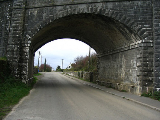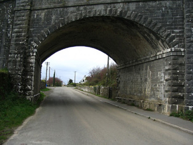 Single-arch railway bridge over road, opened 1850. Broken coursed cut-limestone walls (including curved abutment walls) with rock-faced limestone ashlar pies, and cut-limestone stringcourse supporting parapet having cut-limestone coping (cut-limestone coping to abutment walls) with replacement steel railings over. Single segmental arch springing from cut-limestone stepped stringcourse with rock-faced limestone ashlar voussoirs, and red brick Running bond soffits in diagonal courses. Sited spanning road.