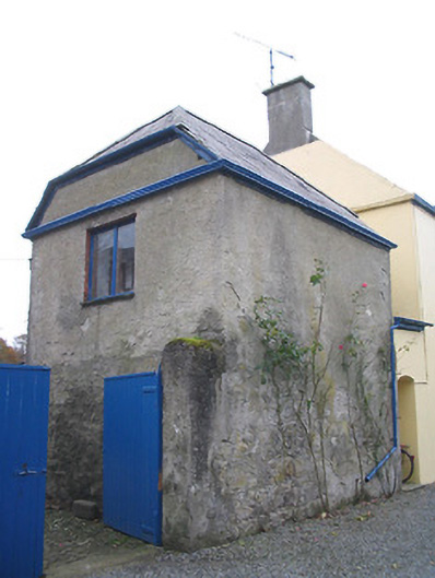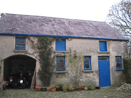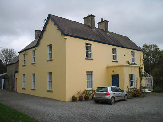 Detached three-bay two-storey house, c.1850, possibly over basement on an L-shaped plan with two-bay two-storey return to north-east. Renovated, c.1900, with single-bay single-storey flat-roofed projecting porch added to centre ground floor. Renovated, c.1950, with single-bay single-storey lean-to conservatory added to side (south-east) elevation. Pitched slate roofs on an L-shaped plan with clay ridge tiles, paired rendered chimney stacks, decorative timber bargeboards to gables, and cast-iron rainwater goods on rendered eaves. Flat roof to porch not visible behind parapet. Lean-to glazed roof to conservatory in timber frame. Painted rendered walls with moulded rendered coping to parapet to porch. Square-headed window openings with cut-limestone sills, and one-over-one timber sash windows to front (south-west) elevation having two-over-two timber sash windows to remainder (including to porch). Square-headed door opening with cut-limestone step, and timber panelled door. Square-headed openings to conservatory with fixed-pane timber fittings. Interior with timber panelled shutters to window openings. Set back from road in own grounds on an elevated site with gravel forecourt, landscaped grounds to site having random rubble stone boundary wall, rubble stone piers leading to cast-iron colonette piers having finials, and iron double gates. (ii) Detached single-bay two-storey outbuilding, c.1850, to north-east. Hipped gabled slate roof with clay ridge tiles, and cast-iron rainwater goods on timber eaves. Unpainted fine roughcast walls over random rubble stone construction. Square-headed window openings in camber-headed recesses with cut-stone shallow sills, rendered red brick dressings having red brick voussoirs, and timber casement windows. Square-headed door opening in camber-headed recess with red brick dressings, and tongue-and-groove timber panelled door. (iii) Detached five-bay two-storey outbuilding, c.1850, to north-east with segmental-headed carriageway to left ground floor. Pitched slate roof with clay ridge tiles, and cast-iron rainwater goods on timber eaves. Unpainted fine roughcast walls over random rubble stone construction. Square-headed window openings with cut-stone sills, concealed brick dressings, timber lintels to first floor, and timber casement windows having tongue-and-groove timber panelled fittings to first floor with four-over-four timber sash window to left first floor. Square-headed door opening with concealed brick dressings, and tongue-and-groove timber panelled half-door having overlight. Segmental-headed carriageway to left ground floor with concealed brick dressings, and no fittings. (iv) Freestanding cast-iron waterpump, c.1900, comprising banded cylindrical shaft with moulded necking supporting fluted profiled cylindrical head having spout (collecting into cut-stone trough), curvilinear 'cow tail' handle having finial, and fluted swept capping having finial.