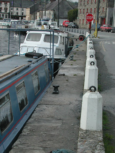 Section of random rubble stone retaining wall, c.1900, with flights of cut-stone steps to water level, squared rubble stone coping, and cast-concrete polygonal mooring bollards having cast-iron loops. Sited flanking River Barrow.