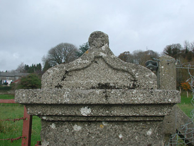 Gateway, c.1900, comprising pair of unpainted rendered piers with stepped cornices supporting ogee-profiled panelled capping, and wrought iron gate. Road fronted.