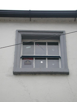 Terraced four-bay three-storey house, c.1825, possibly originally two separate two-bay three-storey houses with square-headed carriageway to right ground floor. Renovated, c.1975, with shopfront inserted to left ground floor. Now disused to left ground floor. Pitched slate roof with clay ridge tiles, red brick Running bond chimney stacks, and cast-iron rainwater goods on rendered eaves having iron brackets. Painted rendered walls with rendered quoins to ends. Square-headed window openings with cut-stone sills, moulded rendered surrounds, six-over-six (first floor) and three-over-three (top floor) timber sash windows. Camber-headed door opening with cut-granite step, moulded rendered surround, inscribed timber pilaster doorcase having consoles supporting entablature, timber panelled door, sidelights on panelled risers, and overlight. Square-headed carriageway to right ground floor with rendered voussoirs having 'keystone', and tongue-and-groove timber panelled double doors. Painted stone-clad shopfront, c.1975, to left ground floor with fixed-pane timber display windows having casement overlights, timber panelled door having overlight, and timber fascia over. Interior with timber panelled shutters to window openings to upper floors. Road fronted with concrete footpath to front.