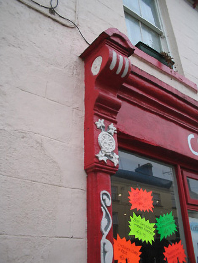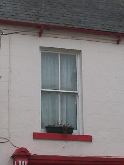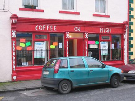 End-of-terrace three-bay two-storey house, c.1850. Renovated, c.1875, with shopfront inserted to ground floor. Reroofed, c.1950. Part refenestrated, c.1975. Pitched roof with replacement artificial slate, c.1950, clay ridge tiles, red brick Running bond chimney stack having saw tooth-profiled course, and cast-iron rainwater goods on rendered eaves having iron brackets. Painted rendered, ruled and lined walls. Square-headed window openings with cut-stone sills, and two-over-two timber sash windows. Rendered shopfront, c.1875, to ground floor on a symmetrical plan with foliate panelled pilasters, replacement fixed-pane (three-light) timber display windows, c.1975, on panelled risers having casement sections, timber panelled double doors having overlight, fascia with decorative consoles, and moulded cornice. Interior with timber panelled shutters to window openings. Road fronted with concrete flagged footpath to front, and painted rendered, ruled and lined boundary wall having decorative cast-iron open work piers with decorative cast-iron gate.