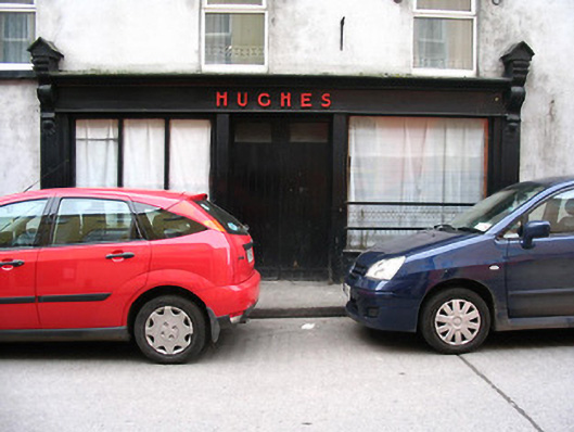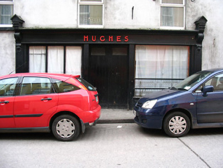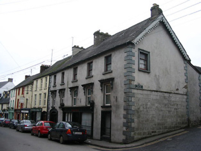 End-of-terrace five-bay three-storey house, c.1850, on a corner site possibly incorporating fabric of earlier house, pre-1840, on site. Renovated, c.1900, with shopfront inserted to ground floor. Part refenestrated. Now disused to ground floor. Pitched (shared) slate roof with clay ridge tiles, rendered chimney stacks, decorative timber bargeboards to gable, and cast-iron rainwater goods on rendered eaves having iron brackets. Painted rendered walls with rendered quoins to corners, and painted rendered, ruled and lined section to ground floor side (north) elevation having rendered stringcourse over. Square-headed window openings with cut-limestone sills, moulded entablatures to first floor on consoles (moulded rendered surround to top floor side (north) elevation), and one-over-one timber sash windows having replacement uPVC casement windows to first floor. Camber-headed door opening with moulded rendered surround, timber doorcase having entablature on consoles, glazed timber panelled door having sidelights on panelled risers, and overlight. Square-headed opening to right ground floor remodelled, c.1900, with moulded rendered surround, fixed-pane timber window having colonette reveals, and wrought iron protective bars. Timber shopfront, c.1900, to ground floor on a symmetrical plan with inscribed pilasters, fixed-pane (one three-light) timber display windows having wrought iron protective/hanging bars, glazed tongue-and-groove timber panelled double doors on cut-limestone flagged threshold, fascia having decorative consoles, raised lettering, and moulded cornice. Interior with timber panelled reveals/shutters to window openings. Road fronted on a corner site with concrete footpath to front.