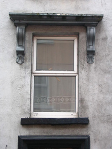 A well-appointed substantial house occupying a large footprint on a prominent corner site in the centre of Graiguenamanagh, thereby making a strong visual statement in the streetscape of Lower Main Street. Incorporating pleasing proportions the architectural design value of the composition is enriched by distinctive attributes including the robust rendered accents throughout lending an elegant Classically-inspired quality to the site: a finely-executed shopfront of artistic design merit further enhances the external expression of the house at street level. However, the continued replacement of the historic fabric with inappropriate modern articles threatens to further undermine the character of the composition.