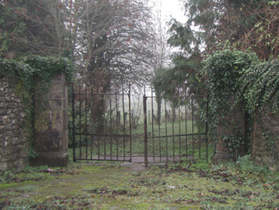 Gateway, extant 1901, on a symmetrical plan comprising pair or limestone ashlar piers on moulded cushion courses on plinths having creeper- or ivy-covered capping supporting wrought iron double gates. Now disused. Road fronted at entrance to grounds of Knocktopher Abbey.