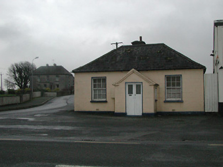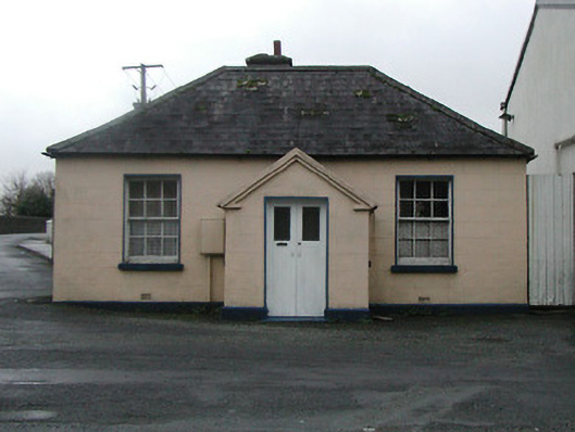 Detached three-bay single-storey building, c.1900, with single-bay single-storey gabled projecting lower porch to centre. Now disused. Hipped slate roof (gabled to porch) with clay ridge tiles, roughcast chimney stack having stepped coping, rendered coping to gable, and cast-iron rainwater goods on rendered eaves. Painted rendered, ruled and lined walls. Square-headed window openings with cut-stone sills, and six-over-six timber sash windows having fixed-pane timber windows to porch. Square-headed door opening with glazed tongue-and-groove timber panelled double doors. Set back from line of road with tarmacadam verge to front.