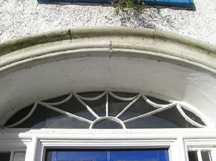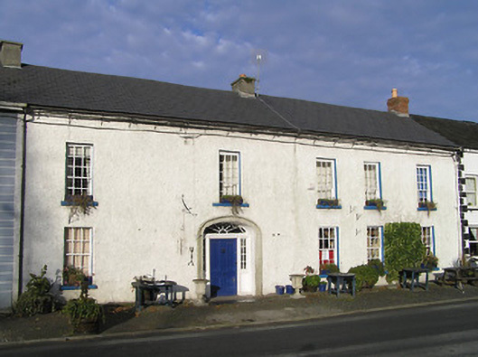 Terraced five-bay two-storey school, c.1800, possibly originally two separate two-bay two-storey (south) and three-bay two-storey (north) ranges. Reroofed. Now in commercial use to part ground floor with remainder in residential use . Pitched (shared) roof with replacement artificial slate, clay ridge tiles, rendered and red brick Running bond chimney stacks, and cast-iron rainwater goods on overhanging rendered eaves having iron brackets. Unpainted roughcast walls. Square-headed window openings with cut-stone sills, six-over-six (ground floor) and nine-over-six (first floor) timber sash windows. Elliptical-headed door opening with cut-limestone step, carved cut-granite surround, timber panelled door having sidelights, and fanlight. Interior with timber panelled shutters to window openings. Road fronted with stone cobbled verge to front.