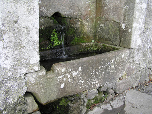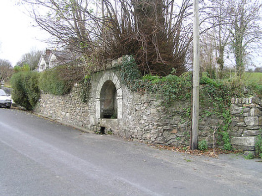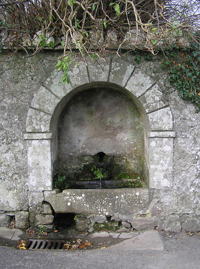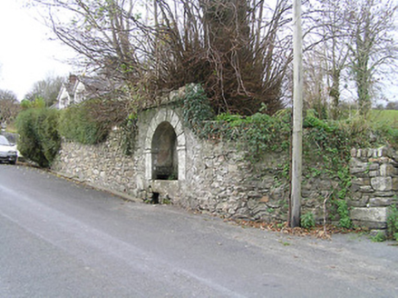 Wall-mounted spring fountain, c.1850, comprising round-headed recess in unpainted rendered wall over random rubble stone construction with cut-stone trough plinth, cut-stone surround supporting cut-stone voussoirs, unpainted rendered recess having aperture to spring, and stringcourse supporting rubble stone coping to parapet. Road fronted.
