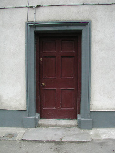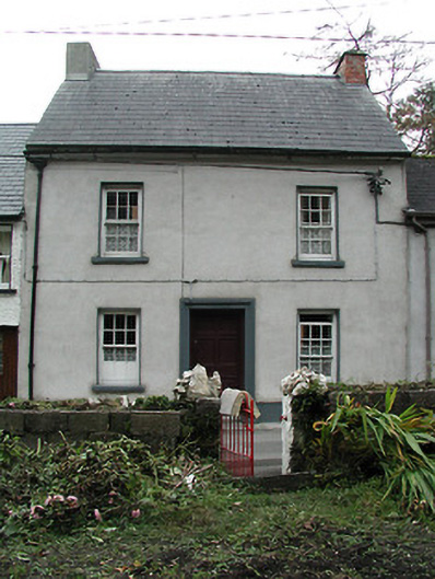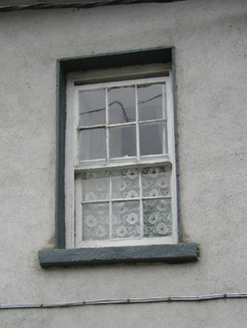 Terraced three-bay two-storey house, c.1825. Extensively renovated. Pitched roof with replacement artificial slate, c.1990, clay ridge tiles, rendered and red brick Running bond chimney stacks, and cast-iron rainwater goods on overhanging rendered eaves having iron brackets. Unpainted replacement cement rendered walls over random rubble stone construction with exposed random rubble stone construction to side (east) and to rear (south) elevations. Square-headed window openings with cut-stone sills, exposed rubble stone voussoirs to rear (south) elevation, and six-over-six timber sash windows. Square-headed door opening with moulded rendered surround, and timber panelled door. Interior with timber panelled reveals to window openings. Road fronted.