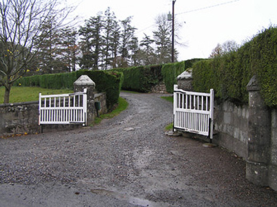 Gateway, c.1925, comprising pair of unpainted rendered cylindrical piers with rendered conical capping, timber double gates, concrete block curved flanking walls, and unpainted rendered cylindrical outer piers having rendered conical capping. Road fronted at entrance to grounds of Berryhill House.