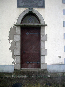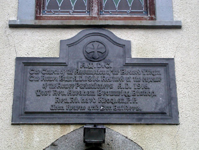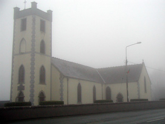 Detached six-bay double-height Catholic Church, built 1816, on a cruciform plan comprising two-bay double-height nave with single-bay (two-bay deep) double-height transepts to north-west and to south-east having single-bay single-storey gabled projecting porch to north-west, and single-bay double-height chancel to north-east continuing into two-bay double-height sacristy to north-east. Renovated, 1916, with single-bay four-stage entrance tower added to south-west on a square plan. Pitched slate roofs on a cruciform plan (gabled to porch) with profiled clay ridge tiles, cut-stone coping having cross finials to apexes, and cast-iron rainwater goods on rendered eaves. Roof to tower not visible behind parapet. Painted rendered walls over random rubble granite construction with rendered quoins to corners, cut-limestone date stone/plaque to tower, rendered stringcourse to third stage to tower, and rendered advanced parapet having rendered coping with corner 'pinnacles'. Pointed-arch window openings with cut-stone chamfered sills, rendered surrounds, timber Y-mullions forming bipartite lancet arrangement, and fixed-pane fittings having leaded stained glass panels. Pointed-arch window openings to second and to third stage to tower (one blind to third stage) with cut-stone chamfered sills (forming part of sill course to third stage), rendered surrounds, Y-mullions forming bipartite lancet arrangement to second stage having leaded stained glass panels, and louvered panel fittings to third stage. Square-headed openings to top (bell) stage to tower with chamfered reveals, and louvered panel fittings. Pointed-arch door openings with cut-granite block-and-start surrounds, and diagonal tongue-and-groove timber panelled doors having overlights. Square-headed door opening to sacristy (forming part over overall pointed-arch opening) with rendered block-and-start surround, and diagonal tongue-and-groove timber panelled double doors. Set back from road in own grounds with unpainted rendered boundary wall to perimeter of site having unpainted rendered piers, and iron double gates having Fleur-de-Lys finials.
